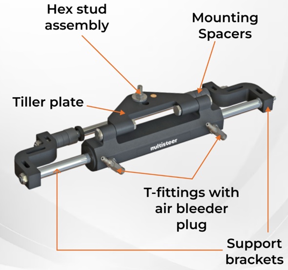Multisteer Front Mount Single Balanced Outboard Cylinders have robust design features and anodized Aluminum tubes. The Cylinder provides linear movement to the engine, steering the boat to starboard or port.